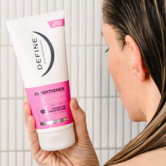 Define Strength and Rebuild Balsam styrker og gjenoppbygger håret samtidig som den forhindrer flisete tupper. Den inneholder kokosolje for ekstra pleie.